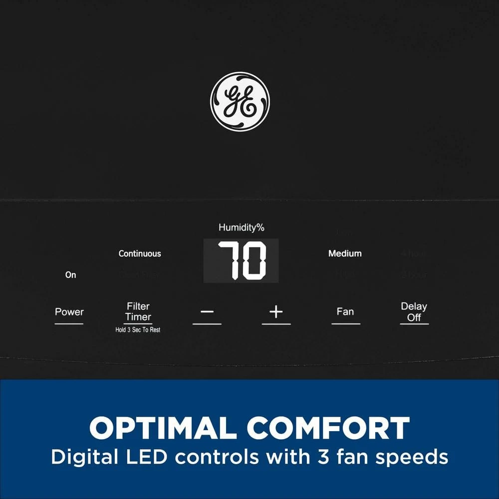 GE Appliances Energy Star dehumidifiers are designed to effectively remove excessive moisture for various dampness levels, offering optimal home comfort for you and your family.This 50 pint Energy Star Dehumidifier removes 50 pints of water from the air per day. This model is ideal for very damp room conditions, anywhere in the home, basement or bedroom. This unit comes with a external hose connection for continuous drain option, or simply empty the bucket when it’s full. The unit works best with a clean filter, so we’ll remind you when it’s time to clean it, ensuring maximum performance and efficiency. The adjustable humidistat allows you to set your desired humidity level anywhere between 30-70% (40% is recommended for maximum comfort). The soft touch control panel and LED digital controls on this GE dehumidifier let you clearly see and manage your settings. This Energy Star model offers 3 fan speeds, auto defrost control, and a 2- or 4- hour off timer, while pocket handles and easy roll hidden wheels make it easy to move from one location to another.