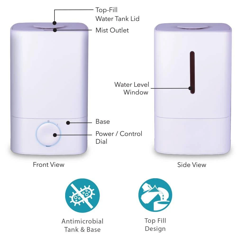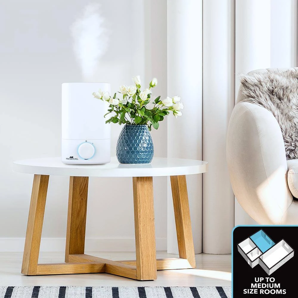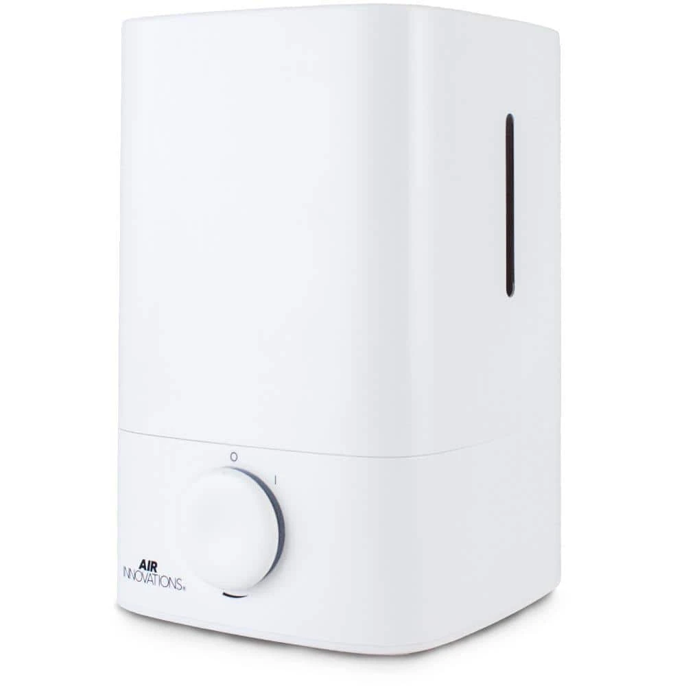 The Air Innovations Top-Fill Ultrasonic Cool Mist Humidifier Model MH-419 is 1 of the top rated, longest running and most versatile humidifiers available for its size. It features a 1.2 Gal. tank that runs for up to 70-hours on low (almost 9-nights of sleep) and is completely silent. And it’s powerful enough to sustain increased humidity levels in medium size rooms up to 400 sq. ft. The tank and base are also made of antimicrobial plastic to help prevent bacteria, mold and mildew growth. It features a convenient top-fill technology so you don’t have to take it to the sink or bathtub for refilling. It’s fantastic to use for baby humidifier or bedroom humidifier. The added humidity will rehydrate your skin, relieve dry eyes, scratchy throats and will help reduce snoring so you sleep better. Additionally, this humidifier will help rehydrate wood furniture, cabinets, wood floors and wooden guitars. From Air Innovations- Sleep Better, Feel Better, Look Better.