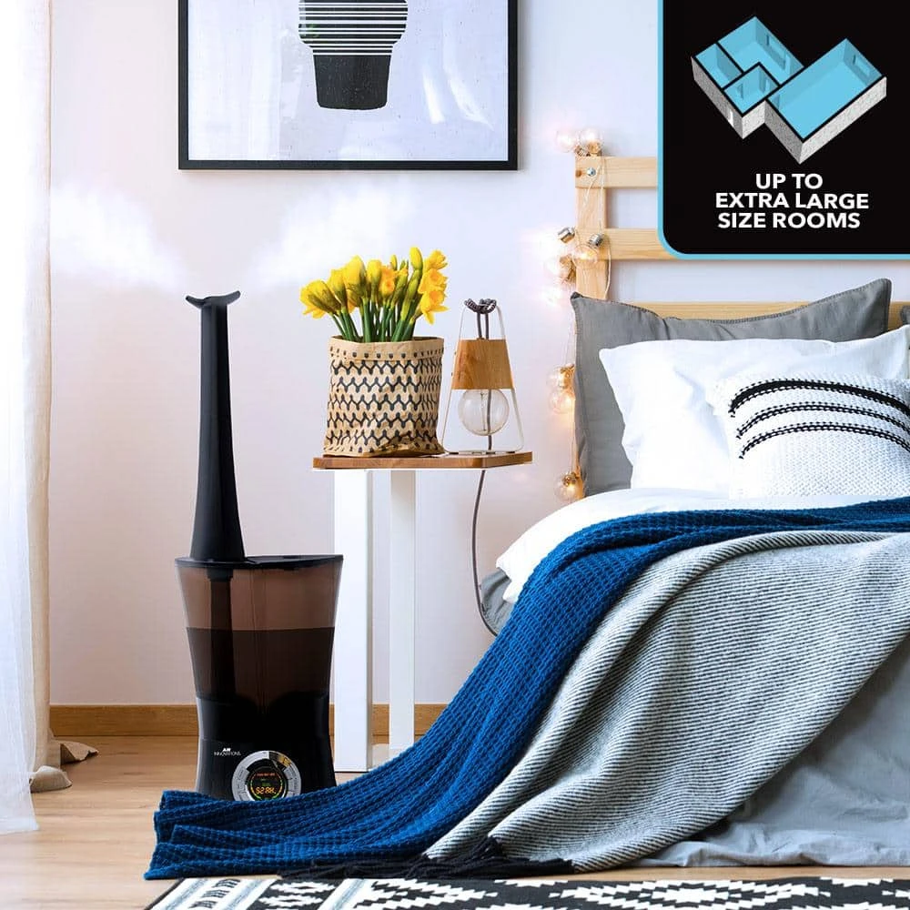The Air Innovations model 901DA ultrasonic, cool mist, top-fill, smart humidifier is 1 of the top rated, longest running humidifiers available for its size. Key Features: built-in aromatherapy tray to release soothing scents into the air, 1.6 Gal. capacity that runs for a full 100-hour (almost 13 nights of sleep) and is completely silent. Powerful enough to add humidity to large rooms up to 700 sq. ft., with a programmable built-in humidistat that monitors and maintains the humidity. The unit and base are made of antimicrobial plastic to prevent bacteria, mold and mildew growth and it comes with a permanent ceramic filter to help trap impurities in your water. Unlike Vicks, Crane and Essick humidifiers, it also features a 16 extension nozzle so it can convert from a table top unit to a floor humidifier in seconds. It has a dual directional mist nozzle to direct the moisture where you want. There’s an extra-wide opening on top for easy filling as well as a fully programmable timer to turn it on and off when you want it to. There’s also an auto safety shut off and audio beep when it runs out of water. Great for kids and babies, this cool mist humidifier also rehydrates your skin, relieves dry eyes, scratchy throats and helps reduce snoring so you sleep better. It also rehydrates wood furniture, cabinets, wood floors and wooden instruments.
