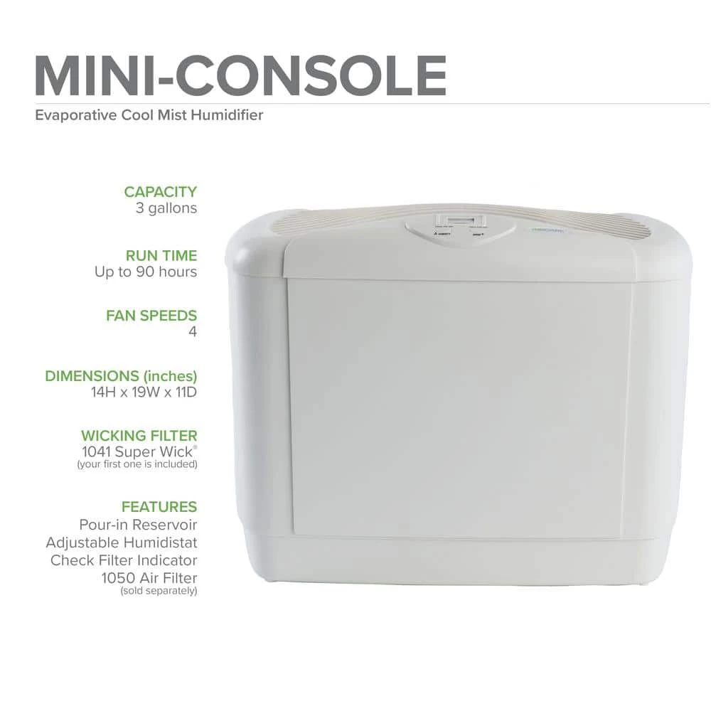 This Mini-Console is the perfect humidifier for multiple rooms or a small home. Its four fan speeds and an adjustable humidistat keep humidification constant and comfortable. Refills are mess-free with this Mini-Console’s top-fill feature – just pour water in and the unit is ready.
