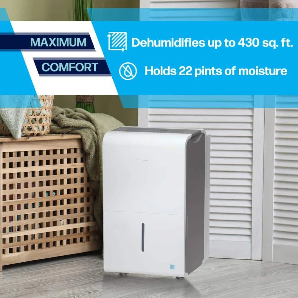 - POWERFUL DEHUMIDIFICATION, COMPACT DESIGN: Removing 22-pints (2.75-gallons) of moisture daily, this ENERGY STAR dehumidifier efficiently dehumidifies small, damp spaces up to 430 sq. ft. Perfect for small spaces impacted by high humidity like bathrooms, laundry rooms, garages and basements.