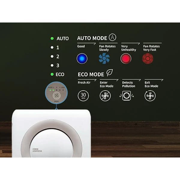 - Coway Airmega’s real-time air quality monitor keeps you informed of the quality of your air. In Auto Mode, the fan and purification levels adjust to the space as needed.