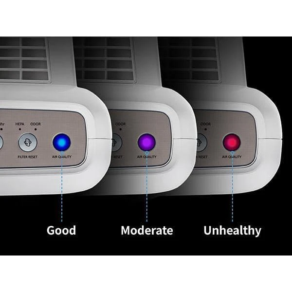 - Pollution sensor communicates indoor air quality in real-time. Brightly colored LED lets you know how clean or dirty your indoor air is every minute of the day. Also features a timer and a filter-lifetime indicator.