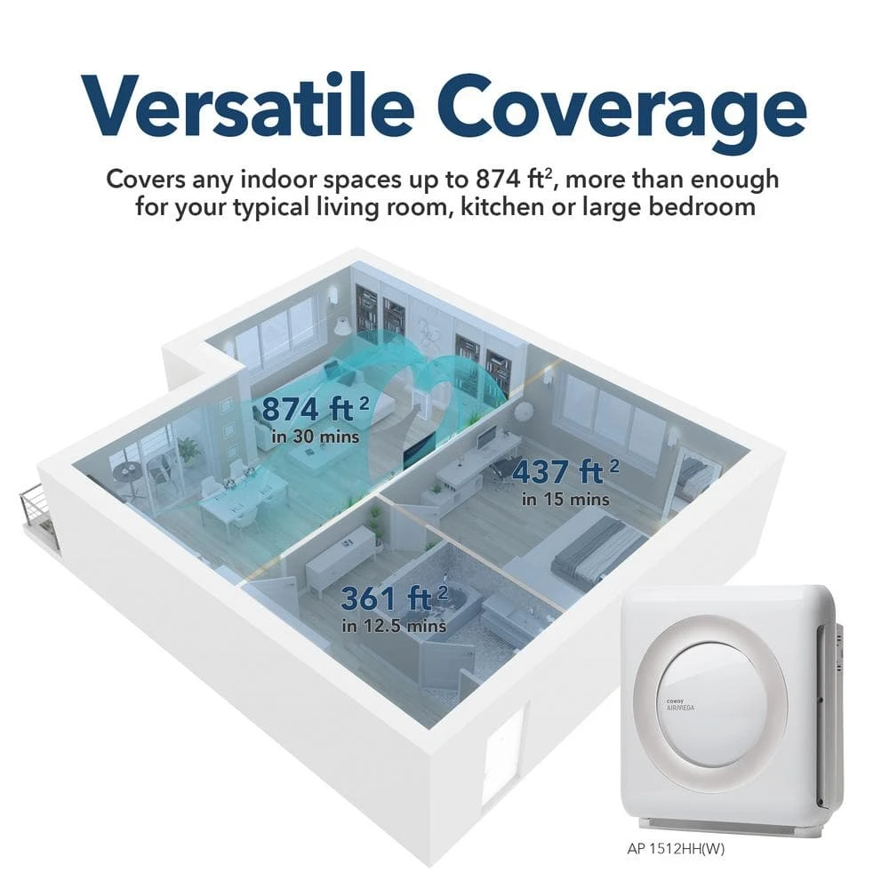 - Coway Airmega AP-1512HH Mighty is designed to accommodate large room sizes up to 361 sq. ft. (CADR: Dust 246 / Pollen 240 / Smoke 233).