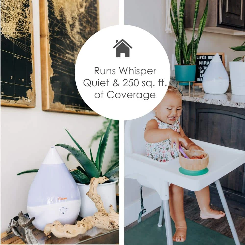 - WHISPER QUIET: Crane’s droplet humidifier runs whisper quiet which makes it the perfect option for light sleepers, kids, and especially babies, this humidifier’s control lights also shut off after 10-seconds to keep from disrupting a good night’s sleep.
