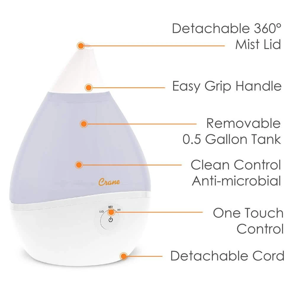 Get relief from cold and flu symptoms and bring wellness to your entire family in style with a Crane Droplet Humidifier. Based off of the award-winning design of the Crane Drop and its top rated performance, Crane’s 0.5 Gal. Droplet ultrasonic cool mist humidifiers provide up to 250 sq. ft. of coverage and 15-hours of soothing moisture to help relieve the effects of dryness and congestion. Use with Crane’s vapor pads (HS-1950 & HS-1950L) for an elevated experience to help you and your family breathe easy and sleep through the night peacefully.