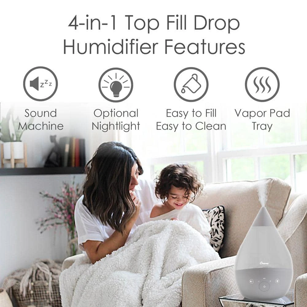 Get relief from cold and flu symptoms and bring wellness to your entire family in style with a Crane top fill Drop humidifier with sound machine. With an award winning design and top rated performance, Crane’s 1.0 Gal. top fill Drop ultrasonic cool mist humidifiers provide up to 500 sq. ft. of coverage and 24-hours of soothing moisture to help relieve the effects of dryness and congestion. Use with Crane’s vapor pads (HS-1950 and HS-1950L) for an elevated experience to help you and your family breathe easy and sleep through the night peacefully.