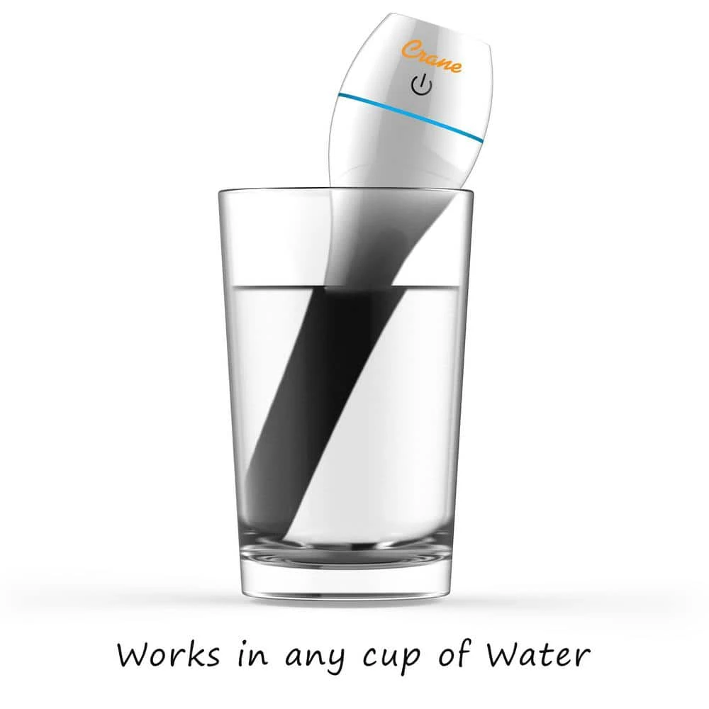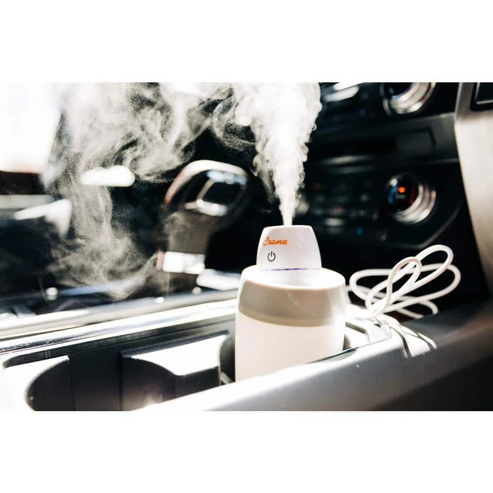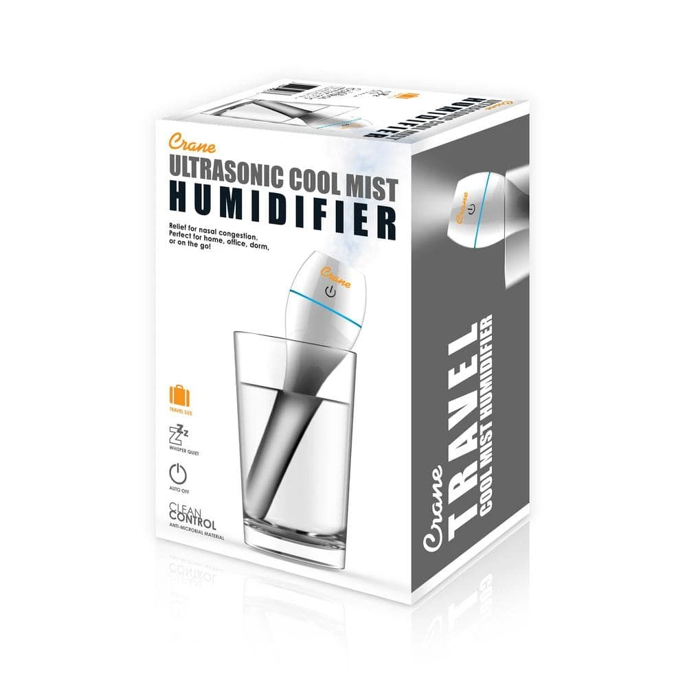 - HUMIDITIY ANYWHERE: The Crane travel cool mist humidifiers work in any cup of water and come equipped with a travel bag, USB plug, AC adapter, starter wicks, & travel cup. The mist output is perfect for humidifying small rooms, cars, desks, or offices.
