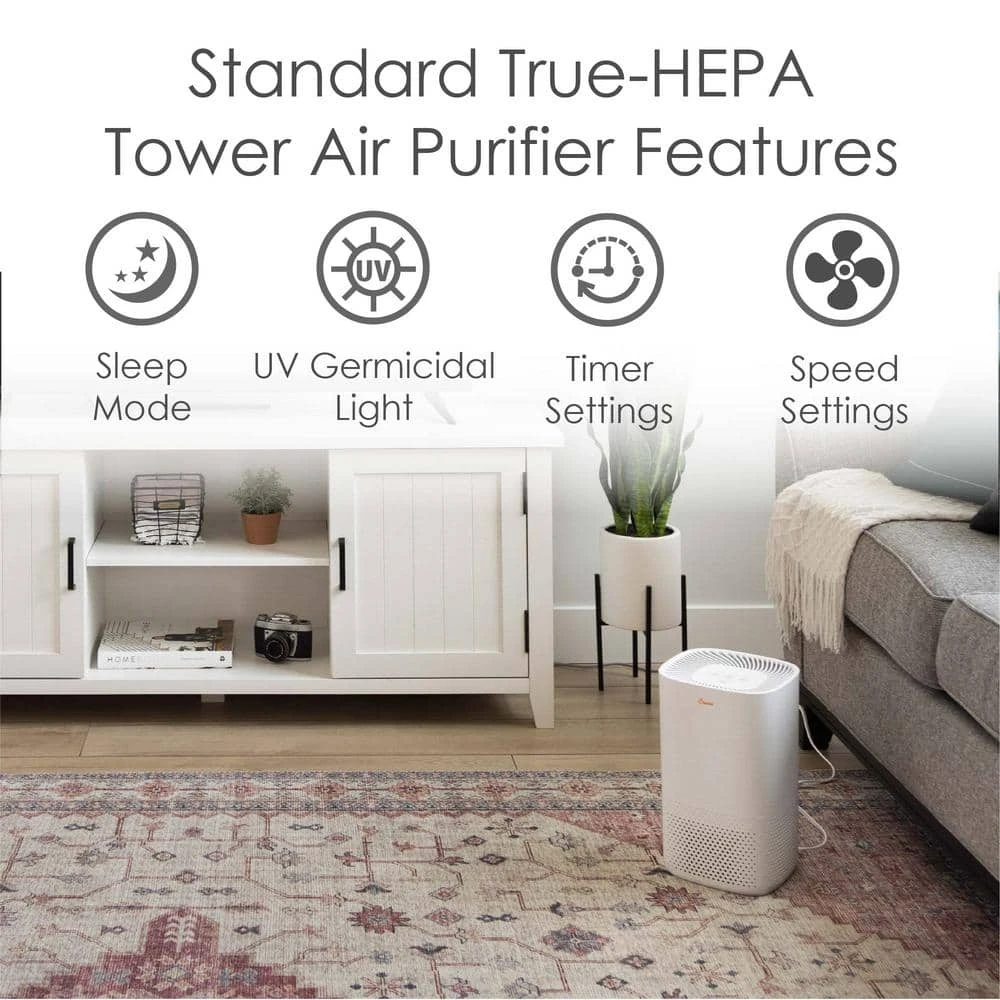 Get comfortable with the air quality in your home with Crane’s innovative standard tower UV air purifier. Crane’s purification system includes a pre-filter, true HEPA filter, and UV lamp. Equipped with a UV lamp, Crane’s standard tower air purifier removes bacteria and germs from the air. With speed settings, and 3 timer settings, you choose how you want to run the show. Crane’s standard tower air purifier provides up to 250 sq. ft. of coverage and will efficiently clean your indoor air by removing pollutants from your home, all the while contributing to your home’s decor.