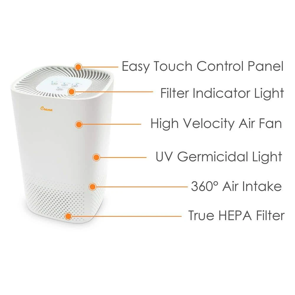 - GERMICIDAL UV LIGHT: Crane’s Tower Air Purifier comes with a Germicidal Ultra-Violet Light that deactivates the DNA of bacteria, viruses, fungi, mold, and other pathogens, destroying their ability to multiply and cause disease. It’s an effective, non-chemical approach to disinfecting your air in order to keep you and your family healthy and safe.