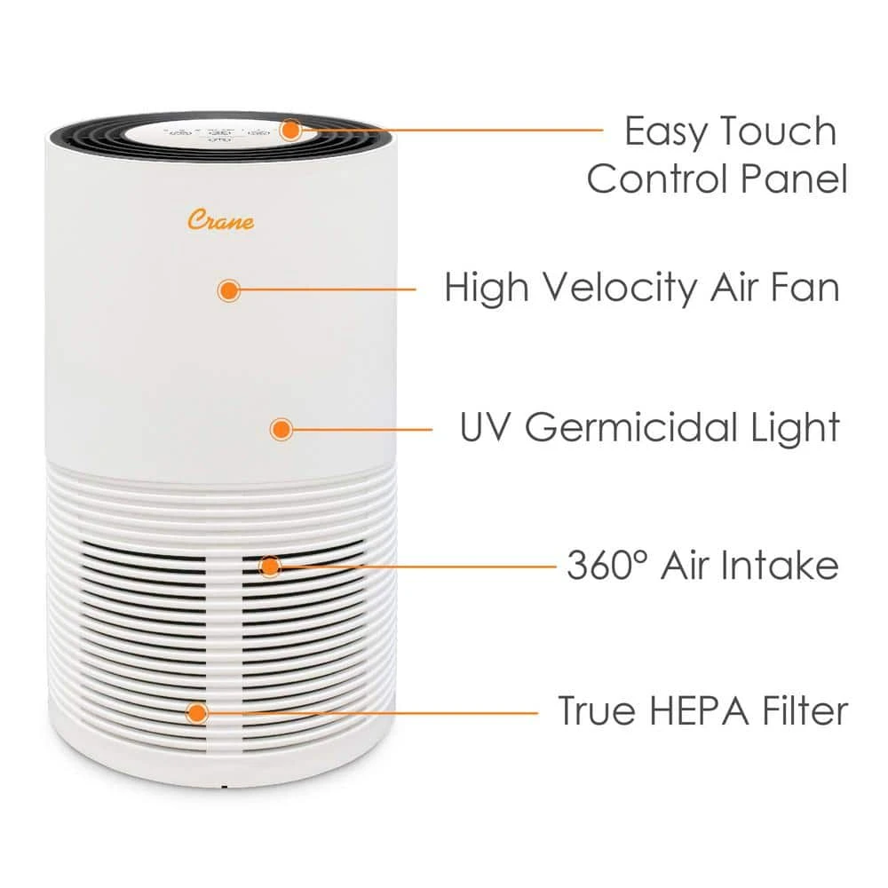 - GERMICIDAL UV LIGHT: Crane’s Tower Air Purifier comes with a Germicidal Ultra-Violet Light that deactivates the DNA of bacteria, viruses, fungi, mold, and other pathogens, destroying their ability to multiply and cause disease. It’s an effective, non-chemical approach to disinfecting your air in order to keep you and your family healthy and safe.