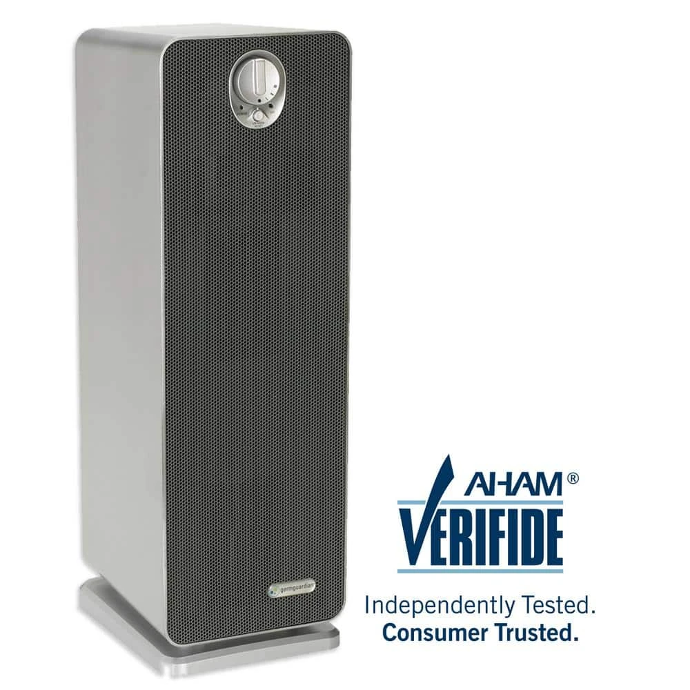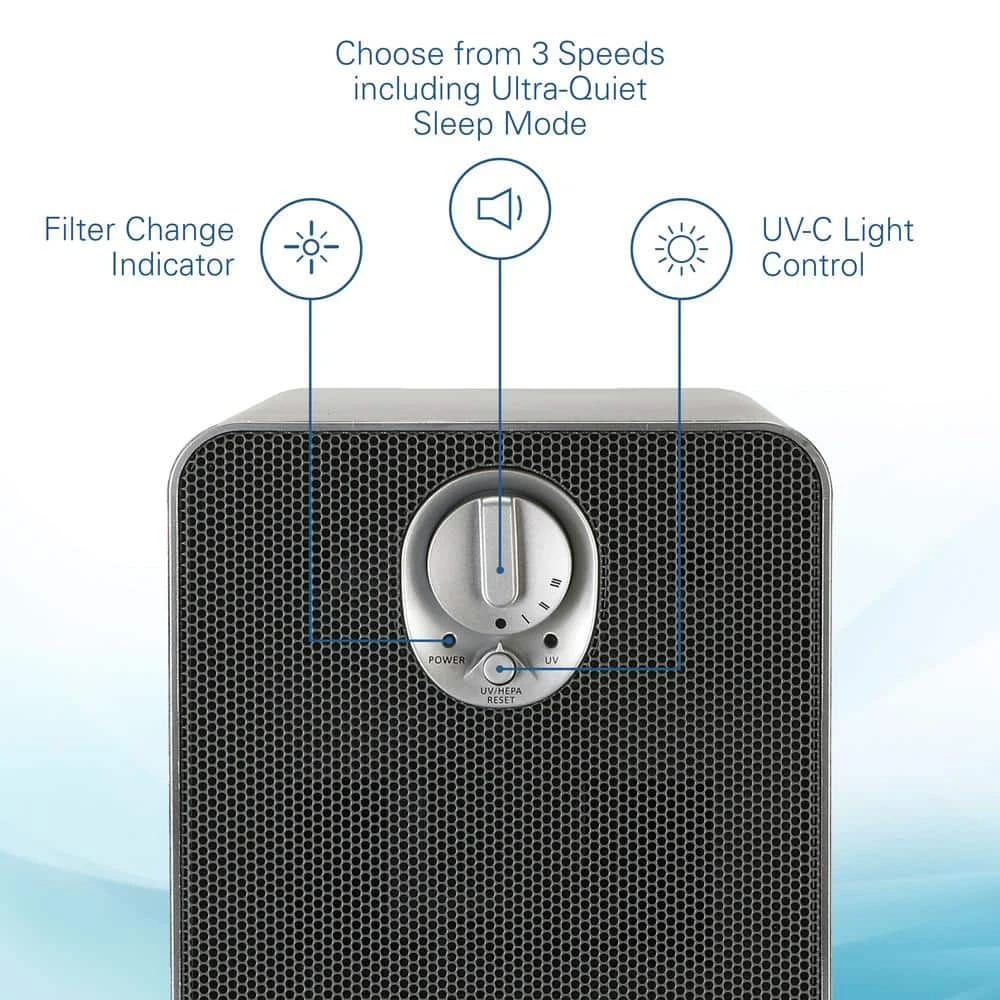 The 4-in-1 True HEPA Air Purifier is perfect for allergy sufferers. With a True HEPA filter, it captures 99.97% of dust and allergens as small as 0.3 microns in size. According to the American Academy of Pediatric Allergy and Immunology, doctors recommend HEPA air filtration to reduce exposure to indoor asthma triggers. More than just a filter, the UV-C light kills germs, while the charcoal filter captures odors. CADR Rated 100+ and standing 22 in. tall, it is lightweight and ideal to use in both small to medium rooms. The Easy-to-use controls include UV-C control and 3 speeds, including a low speed that runs ultra-quiet. The simple, stylish design looks great in any home environment.