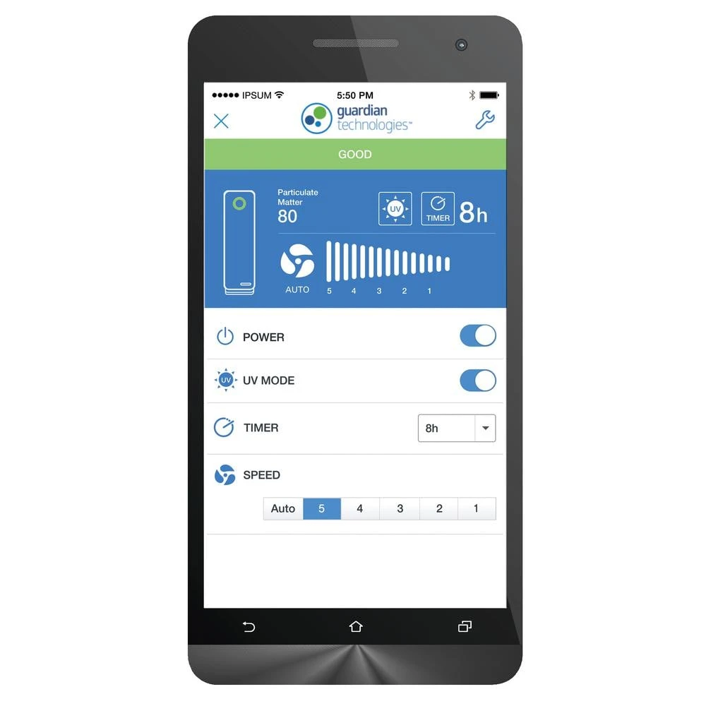 The 4-in-1 Air Purifier is perfect for allergy sufferers. True HEPA media captures 99.97% of allergens including pet dander, dust mites and pollen. According to the American Academy of Pediatric Allergy and Immunology, doctors recommend HEPA air filtration to reduce exposure to indoor asthma triggers. More than just a filter, the UV-C light kills germs, while the charcoal filter captures odors. CADR Rated 125+ and standing 28 in. tall, it is lightweight and ideal to use in medium to large sized rooms. The easy-to-use smart app that allows you to monitor the air quality in your home from EVERYWHERE. This Smart Air Purifier is Voice Control Capable with an Alexa Skill. It includes SmartAQM, an Air Quality Monitor that detects the amount of particles in the air and automatically adjusts the speed to optimize room air quality when in auto mode. The Guardian Technologies App will tell you when you need to replace your filter or bulb and will also keep you updated on the allergy conditions in your area! Choose from 5 speeds, including a low speed that runs ultra-quiet and is energy efficient. The Elite Collection provides both form and function to provide a superior air cleaning system. The simple, stylish design looks great in any home environment.