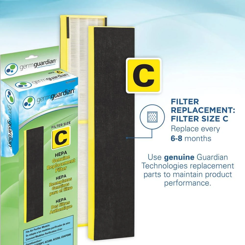 - Only one single filter needs to be replaced every 6-8 months depending on the use of the product. Replacement filter is filter C (model FLT5000). To lengthen the life of your filter a 4 pack of the carbon filters is also available (model FLT28CB4). IMPORTANT: Use GENUINE Guardian Technologies replacement parts to maintain product performance and warranty