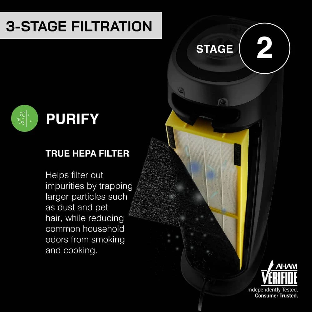 - True HEPA Filter captures 99.97% of dust and allergens as small as 0.3 microns such as household dust, pet dander, mold spores and plant pollens