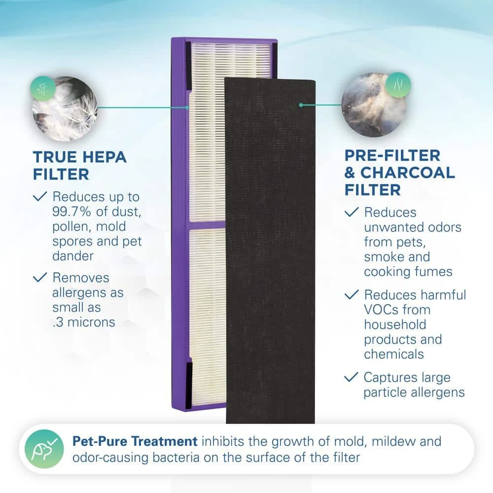 GermGuardian FLT4850PT True HEPA with Pet Pure Treatment GENUINE Replacement Filter B is a combination filter. It includes a True HEPA filter that captures 99.97% of allergens as small as 0.3 microns. It also contains a PetPure Filter Treatment that includes an anti-microbial agent to inhibit the growth of mold, mildew and odor-causing bacteria on the surface of the filter. The pre-filter/activated carbon filter that captures odors from cooking, pets and smoking. It is recommended to use with the GermGuardian AC4900, AC4825, AC4850PT, PureGuardian AP2200CA and BLACK+DECKER Model BXAP148. The use of this genuine Guardian Technologies replacement part will maintain the product’s performance and warranty.