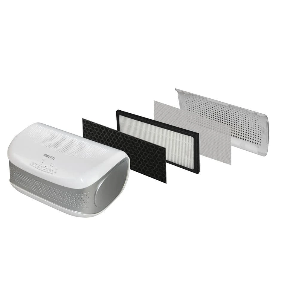 There’s a better way to clean the air you and your family breathe. Purify the air in your home with the HoMedics TotalClean HEPA-Type Small Room Air Purifier. It captures up to 99% of airborne contaminants as small as 2 microns, giving you cleaner, fresher air – especially remarkable due to its convenient desktop design. The AP-DT10 model cleans the air in rooms up to 128 sq. ft./11.9 sq. m., removing allergens, dust, smoke, mold spores and germs. The optional ionizer releases negative ions to help the purification process, while the carbon odor filter reduces unwanted odors and captures large particles. Features 3 speeds, Replace Filter indicator and an auto-off timer, up to 8 hours. Includes 1 HEPA-type filter and 1 carbon odor filter.