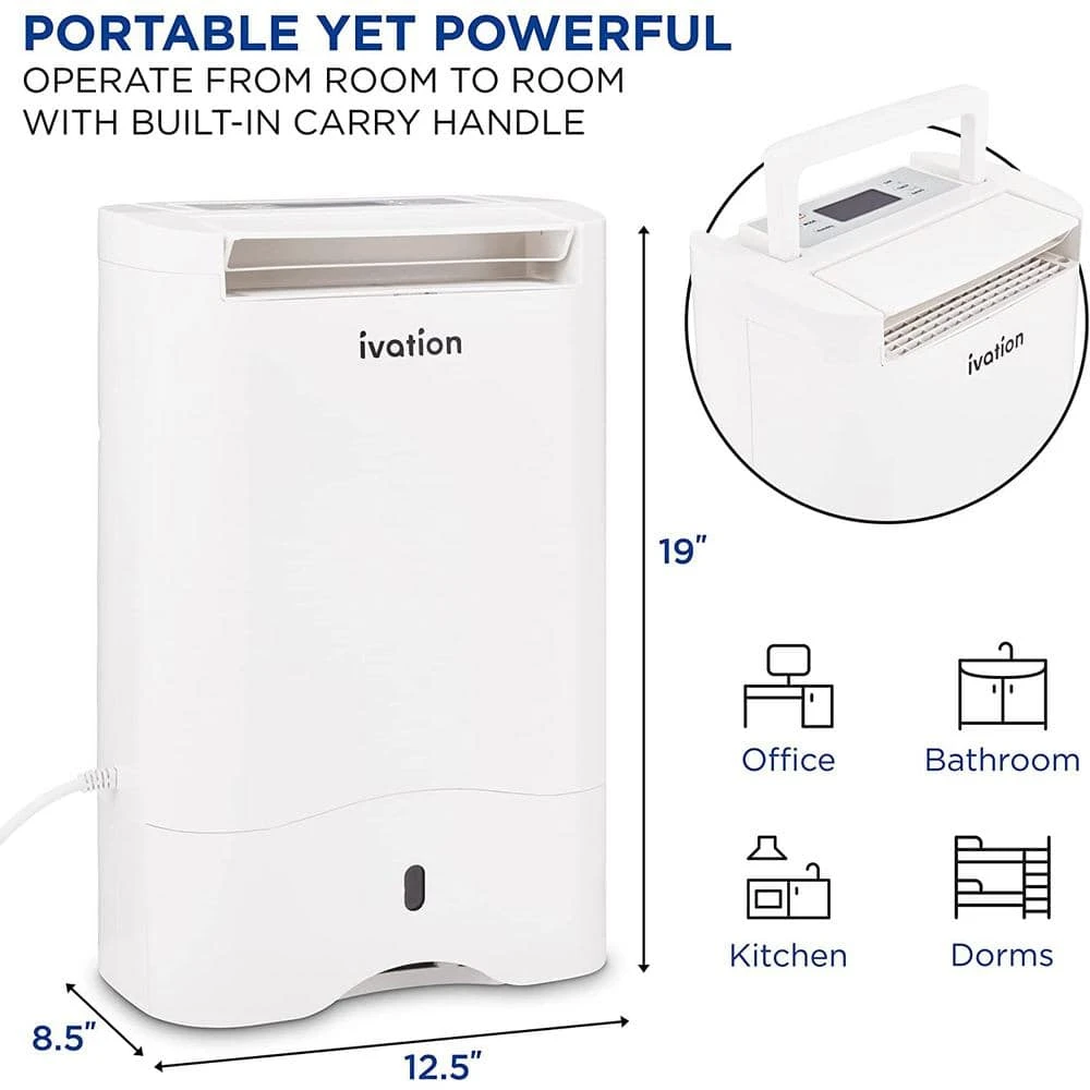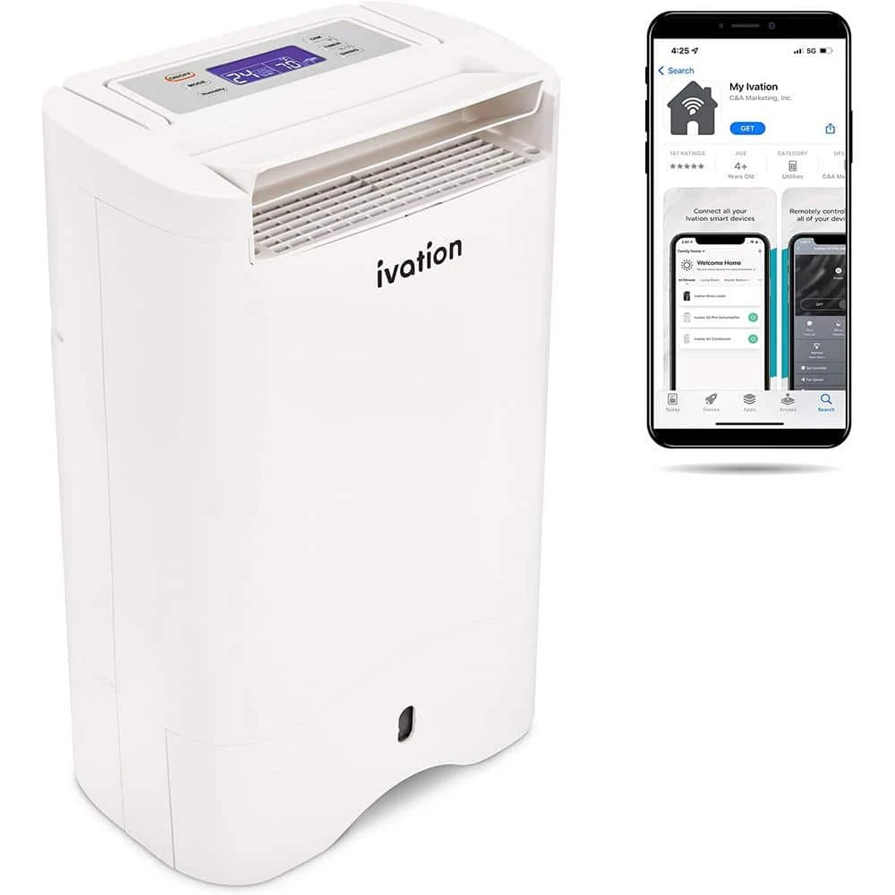 Keep a dry, comfortable environment with the Ivation Smart WIFI Dehumidifier with Smartphone Control . Unlike inefficient thermoelectric models, our dehumidifier with pump removes pints of moisture per day and takes up minimal space, making it ideal for a variety of indoor environments such as basements and more, Smart technology Ivation dehumidifier lets you set the perfect moisture level, Package includes dehumidifier with pump and drain hose. Get better air quality even in cooler seasons with operation that works year-round Easy to clean: Maintenance is a breeze with the removable air filter that is easy to clean and reinstall Works hard while you sleep. Dimmable backlight and sleep mode make this dehumidifier great to use day or night. Dimensions – 19 in. H x 12.5 in. Wx 8.5 in. D.