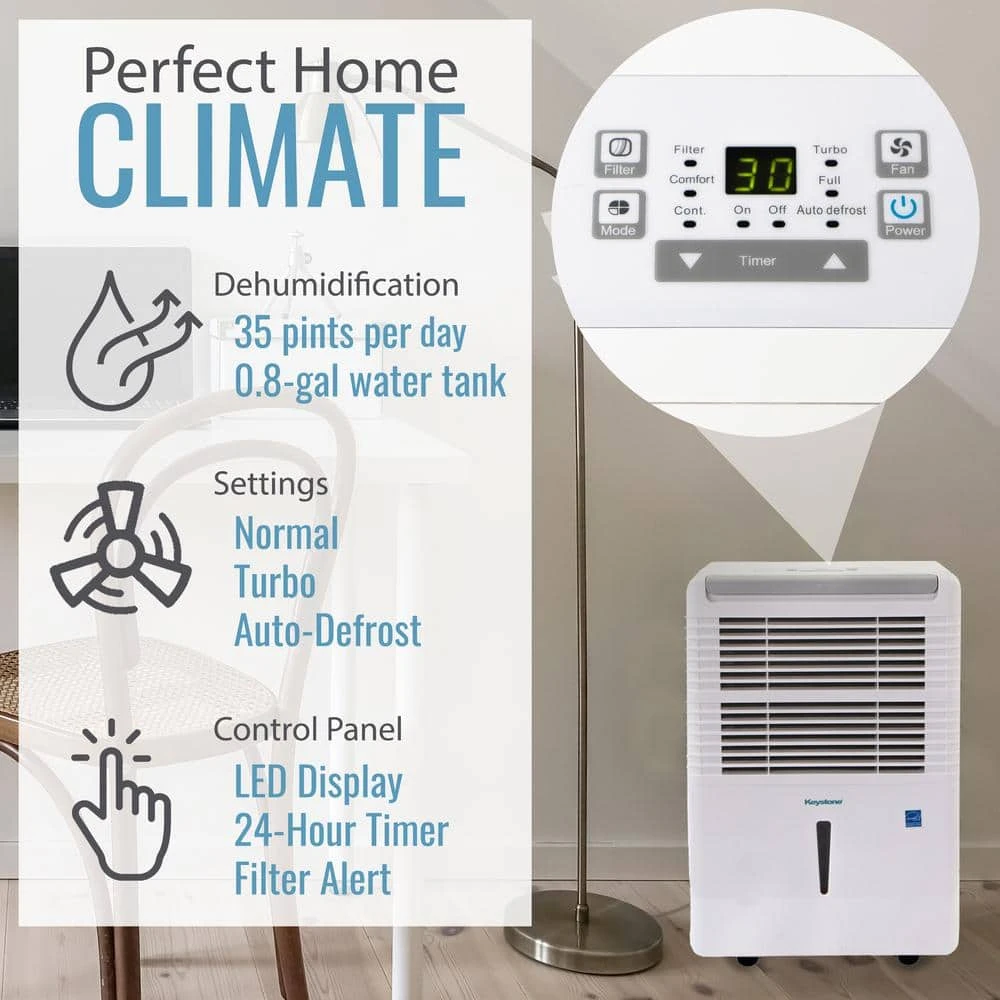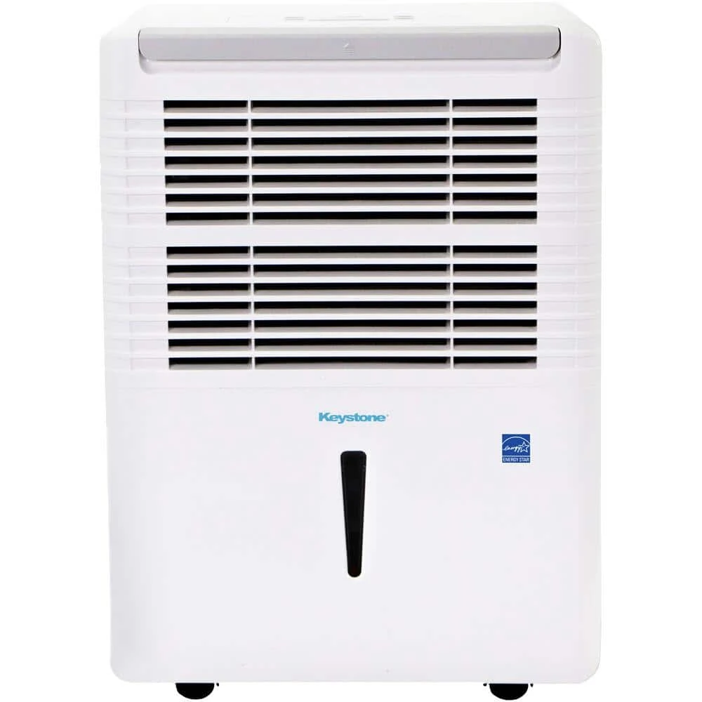 The Keystone 35-pint dehumidifier removes up to 35-pint of moisture from the air per day in a room up to 3000 sq. ft. Features include electronic controls with LED display, a 24-hour timer, a transparent water level indicator and a full bucket alert with automatic shutoff. It also has a removable, easy-cleaning dust filter with a clean-filter alert. The auto-restart saves your settings during a power outage and the rolling casters make the unit easy to move to another location.