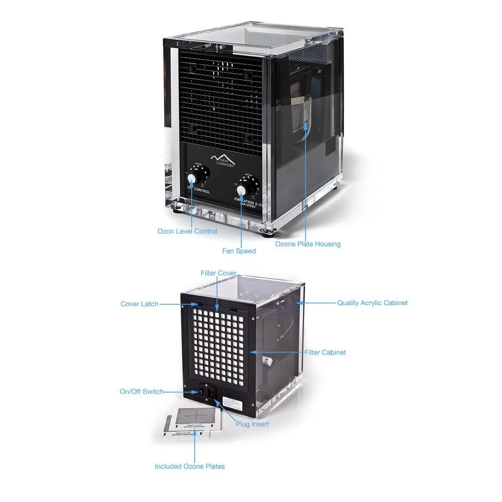 - This is an attractive New Comfort 6 Stage Air Purifier and Ozone Generator. This purifier is ultra-quiet because of its modern variable speed motor. Its 5-speed fan can be set so quiet that you can hardly hear it and it covers up to an amazing 3,000 square feet.