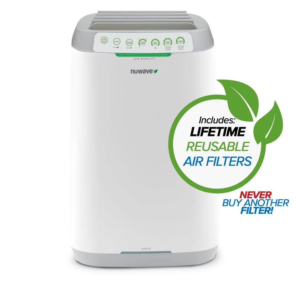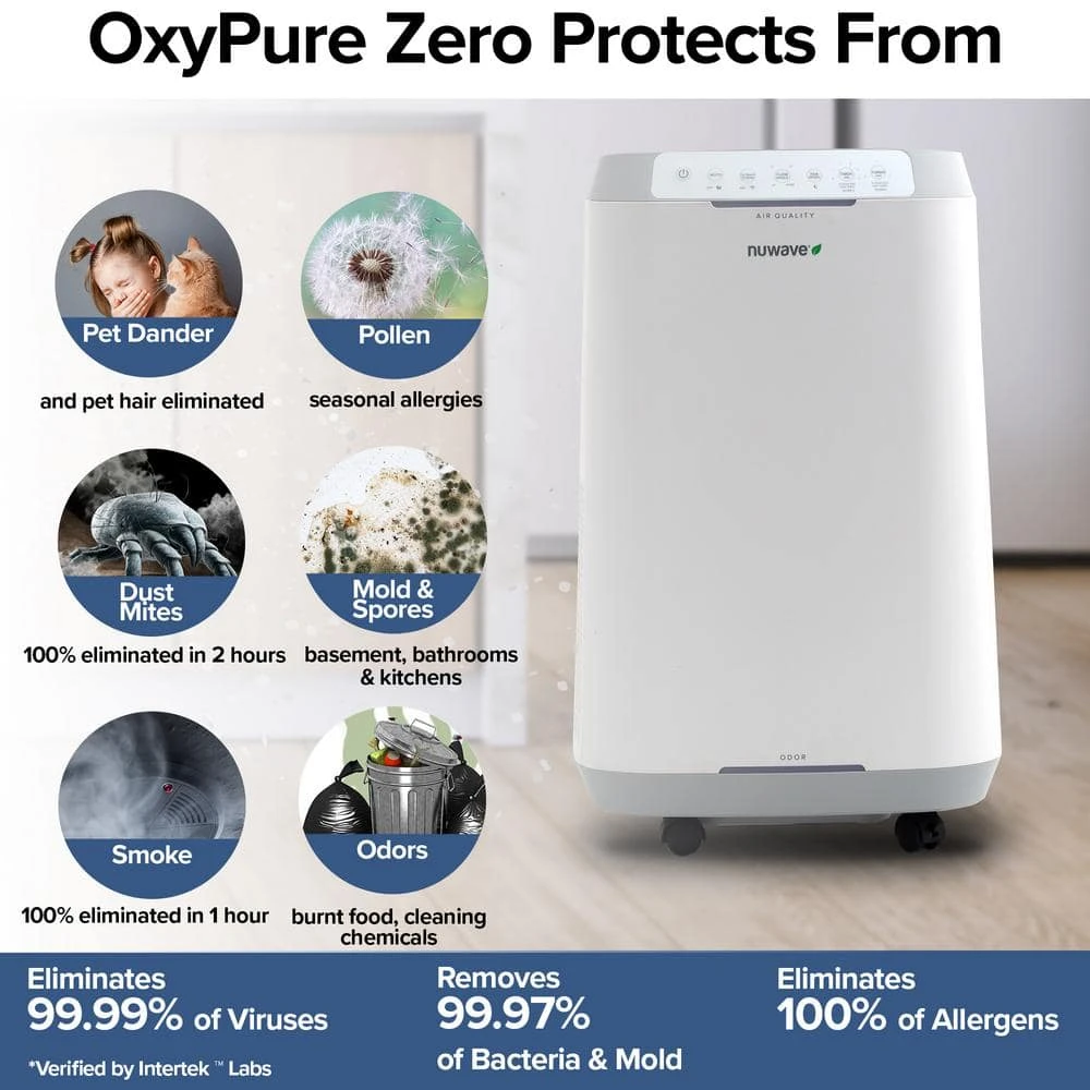 The NuWave OxyPure zero Air Purifier features an advanced Dual 4-Stage Filtration System that can eliminate up to 99.97% of bacteria and 99.99% viruses in the air. The OxyPure Zero features dual-side air intake so you can enjoy clean air no matter where you have your OxyPure sitting in your room. NuWave OxyPure Zero Bio-Guard Air Purifier, Never Purchase Replacement Filters Again, Cleans 1000 sq. ft., Captures and Eliminates Dust, Pollen, Pet Dander, Lead, Formaldehyde, Gases, VOCs. No Filter Replacement; Permanent Filters; Washable Filters; Reusable Filters.