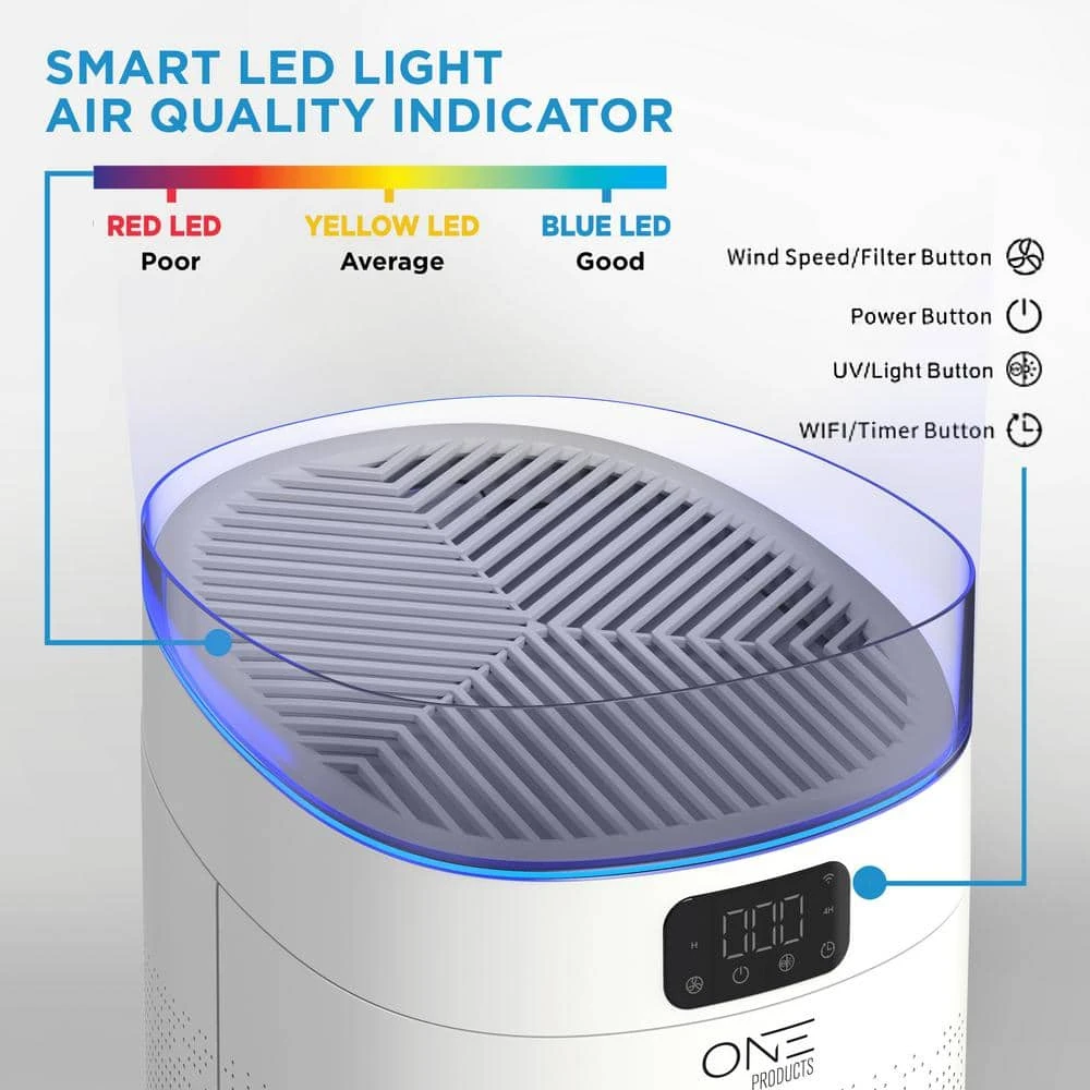 Upgrade the way you live with this Smart Air Purifier with WiFi (OSAP02) by ONE by Promounts. With loads of functionality and stylish modern design, you can ensure that toxins are removed from any home, office, apartment, or workroom.The top-of-the-line 3 in 1 HEPA Air Filter is guaranteed to eliminate 99.97% of odors and particles (such as virus, pollen, allergens, bacteria, pet dander, dust mites, gases, cigarette smoke and many more) leaving you with the reassurance that you can breathe freely.The ATHENA Air Purifier will purify up to 500 square feet and is the perfect addition for any large room. The air quality detector allows you to breathe easy and worry-free. Using colored LED light sensors, you will be quickly notified of 3 different air qualities (good, moderate, poor) and adjust between 4 fan speeds to ensure your space is purified of any lingering toxins. With the built-in Auto Mode, fan speeds will automatically adjust according to the present air quality, freeing you of any hassle or worry.Also included, the built-in UVC Light kills 99.99% of germs to ensure a clean indoor environment. Download the Smart Life App to provide hands-free voice control by syncing with Google Home Assistant and Amazon Alexa for the ultimate experience.Get the most out of the products you love and enjoy. It is our goal to help you get the most out of life, and our products help to take the worry and hassle out of the equation.