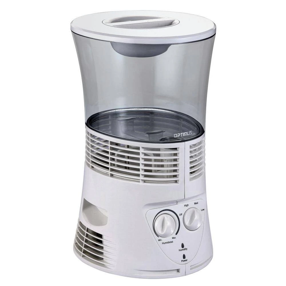The Optimus 3.0 gal. Cool Mist Evaporative Humidifier adds moisture to a 500-700 sq. ft. area. It can operate for 12 hours in high setting without having to refill it. This Quiet Operation Humidifier features rotary power speed setting for added convenience.
