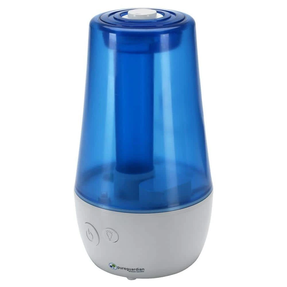The 70-hour Ultrasonic Cool Mist Humidifier guards against problems caused by dry air in the home. It features an easy to fill 1 Gal. tank, ideal for use in medium sized rooms. Unlike humidifiers that grow mold on the water tank surface, Silver Clean Protection is embedded in the tank to fight the growth of mold and mildew on the surface of the water tank. Thanks to ultrasonic technology, it disperses a fine mist into the air, and is ultra-quiet making it ideal to have on while you sleep. This table top humidifier has an optional aromatherapy tray so a few drops of essential oil can be added to create a relaxing atmosphere. The humidifier emits a soothing cool mist, and a low water indicator light lets you know when it’s time to refill the water tank. Night light feature makes it a great addition to kids’ rooms. PureGuardian humidifiers create a better home environment for those suffering from colds, allergies and dry skin. Note: Run time is based off of running the unit on low speed, also depends on atmospheric conditions.