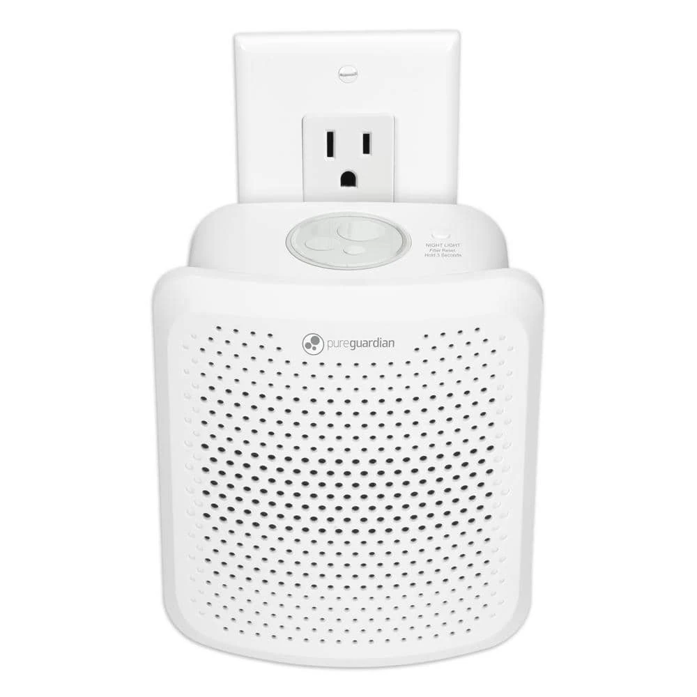 Improve your indoor air quality with the PureGuardian Odor Eliminating Pluggable Air Purifier. Small and compact, this pluggable air purifier provides cleaner and fresher air. The allergen filter captures airborne particles such as dust, pollens, mold spores, debris and pet dander while the activated carbon layer helps reduce common household odors caused by bacteria, smoke, pets and cooking fumes. Thoughtfully designed, the air purifier plugs easily into the wall outlet making it perfect for laundry rooms, pet spaces, bathrooms, nurseries, hallways and kitchens. Equipped with an optional nightlight, this air purifier is perfect for dark hallways and other dim areas in home. Add a drop of your favorite PureGuardian essential oil to the essential oil tray to freshen the air and create a relaxing atmosphere. Easy to control and easy to maintain, the nightlight notifies you when it’s time to change the filter. IMPORTANT: Use genuine Guardian Technologies replacement parts to maintain product performance. 1-year limited manufacturer warranty.