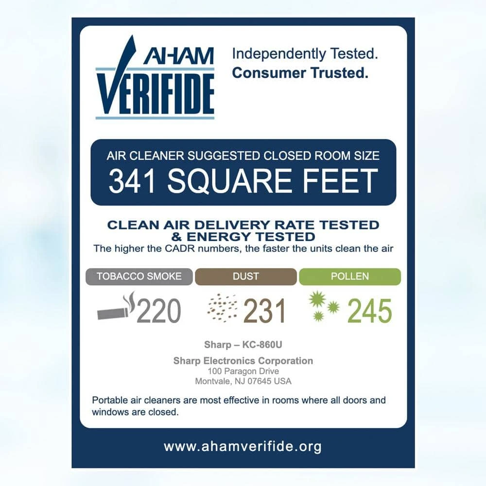 The Plasmacluster 7,000 Series KC860U Air Purifier with Humidifier by SHARP is your ideal choice for large rooms. Effective up to 1,650 sq. ft. at one air change per hour, the KC860U will filter the air in the AHAM Suggested Room Size of 341 sq ft. at 4.8 air changes per hour. The SHARP long-life True HEPA filter and the long-life Activated Carbon filter last up-to 5 years, depending on the environment. The KC860U is AHAM Verifide Tested to provide a Clean Air Delivery Rate (CADR) for three common irritants and allergens, Smoke (220), Dust (231), and Pollen (245). It is certified by the California Air Resources Board (CARB) to meet its strict emission standards. The KC860U features Max, Med, and Low fan speeds, plus Pollen, Quick Clean, and Auto Mode. In Auto Mode, the sensors will monitor your air quality and adjust the fan speeds automatically. The KC860U includes a humidifier that may make your home more comfortable. The Library Quiet Low setting is perfect for the bedroom.