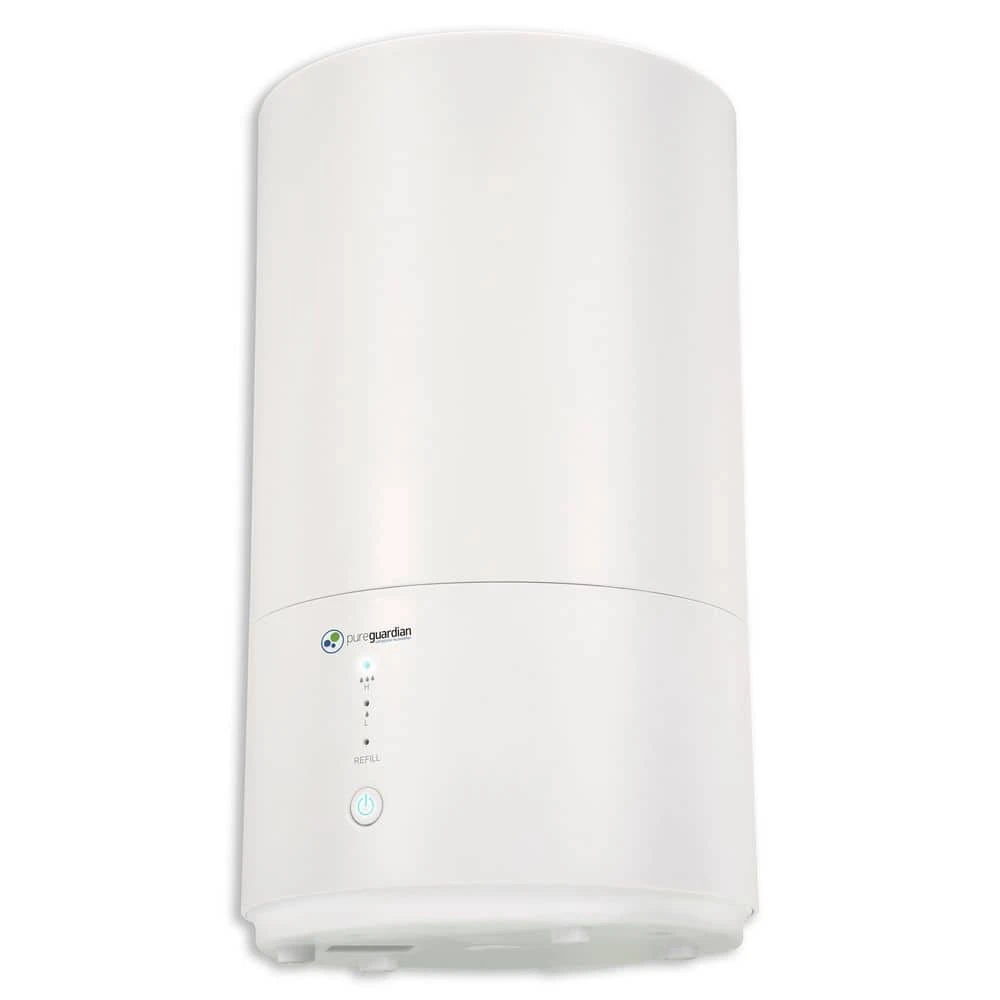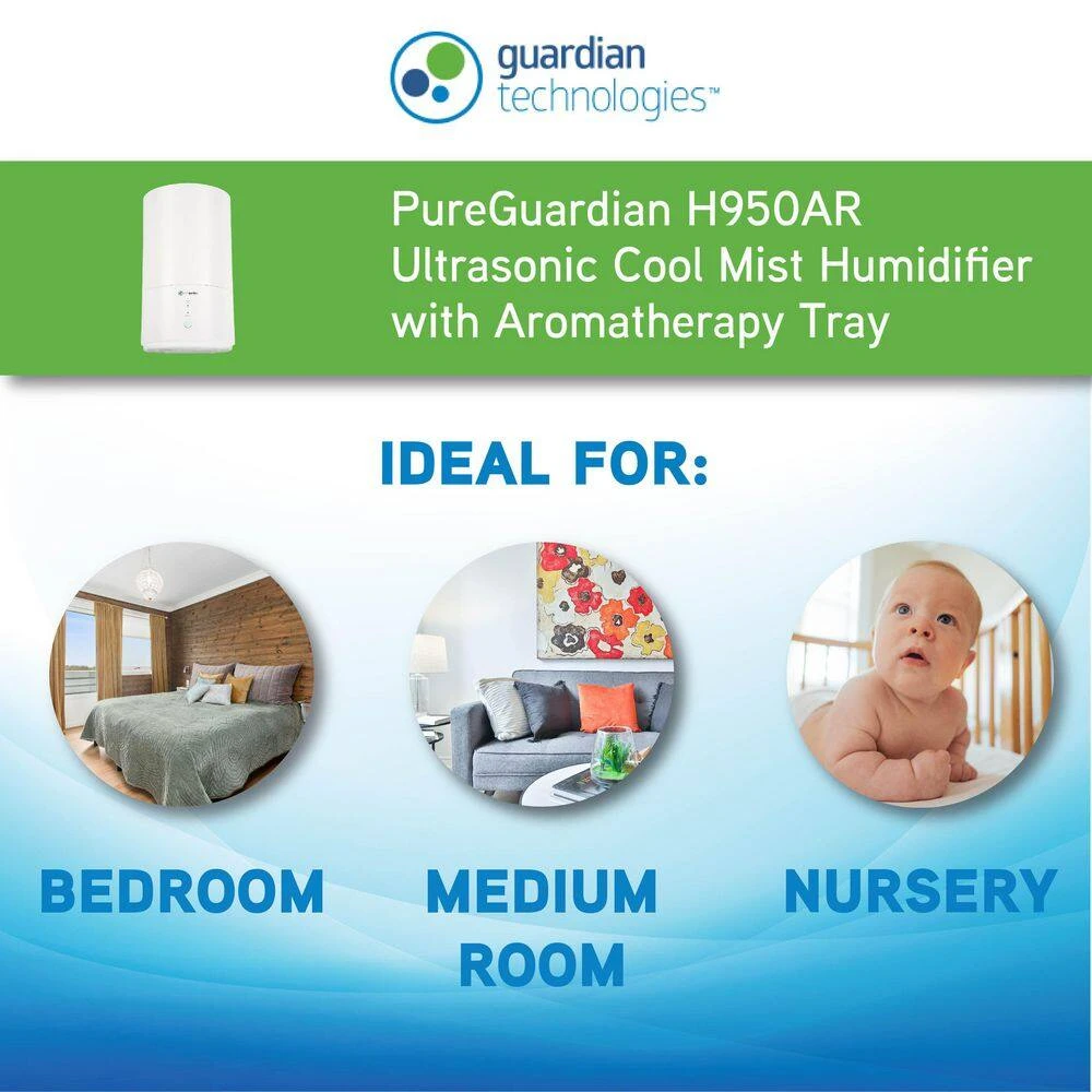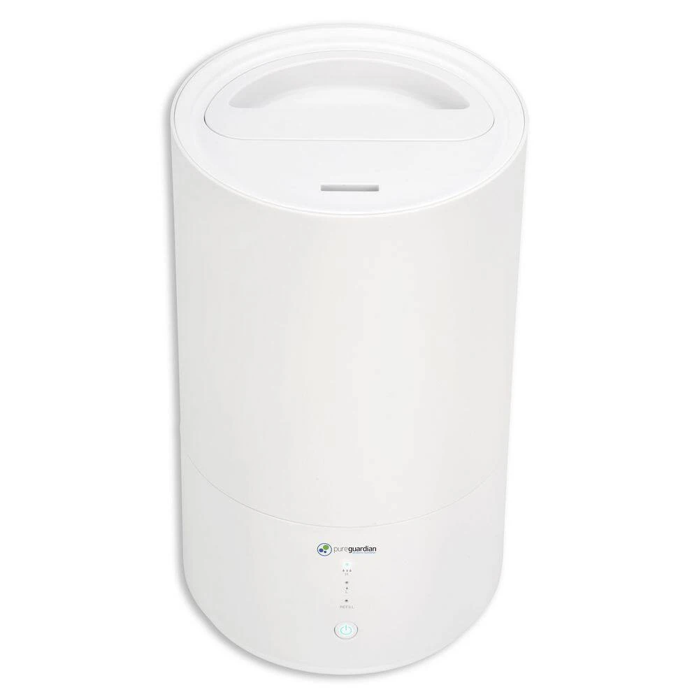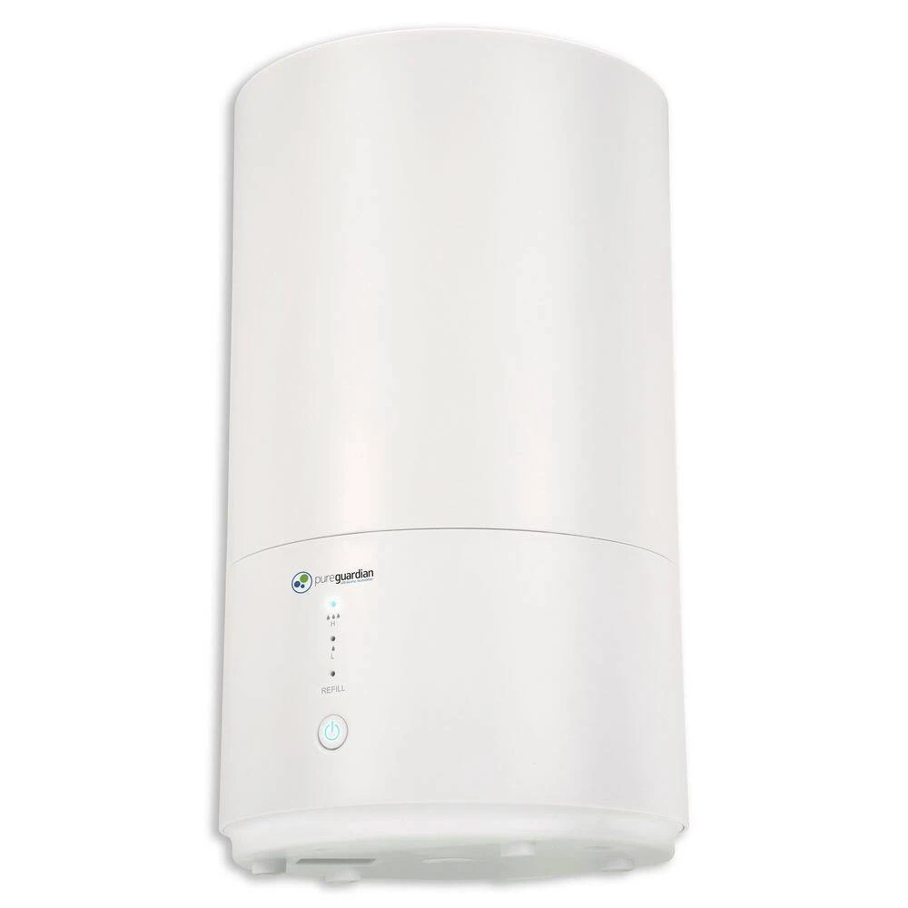 This compact 30 hour Ultrasonic Cool Mist Humidifier guards against problems caused by dry air in the home. It features an easy to fill .80 gallon tank, ideal to use on table tops, for use in small to medium rooms. Unlike other humidifiers that grow slimy mold on the water tank surface, Silver Clean Protection is embedded in the tank to fight the growth of mold and mildew on the surface of the water tank. Thanks to ultrasonic technology, it disperses a fine mist into the air, and is ultra-quiet making it ideal to have on while you sleep. It has an optional aromatherapy tray so a few drops of essential oil can be added to create a relaxing atmosphere. A low water indicator light lets you know when it’s time to refill the water tank, and auto shut off feature when the water is too low. PureGuardian humidifiers create a better home environment for those suffering from colds, allergies and dry skin. Note: Run time is based off of running the unit on low setting and cool mist, also depends on atmospheric conditions.