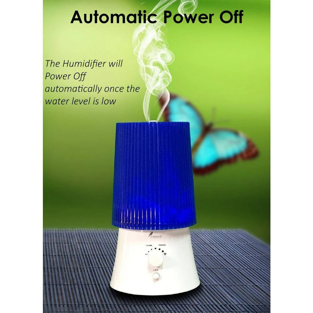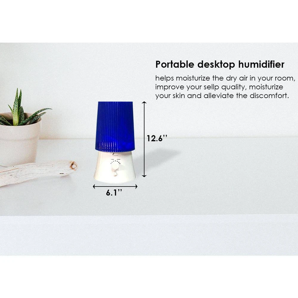 - Portable blue humidifier with cute and compact design and an On/Off switch LED light, perfect for any home or office space